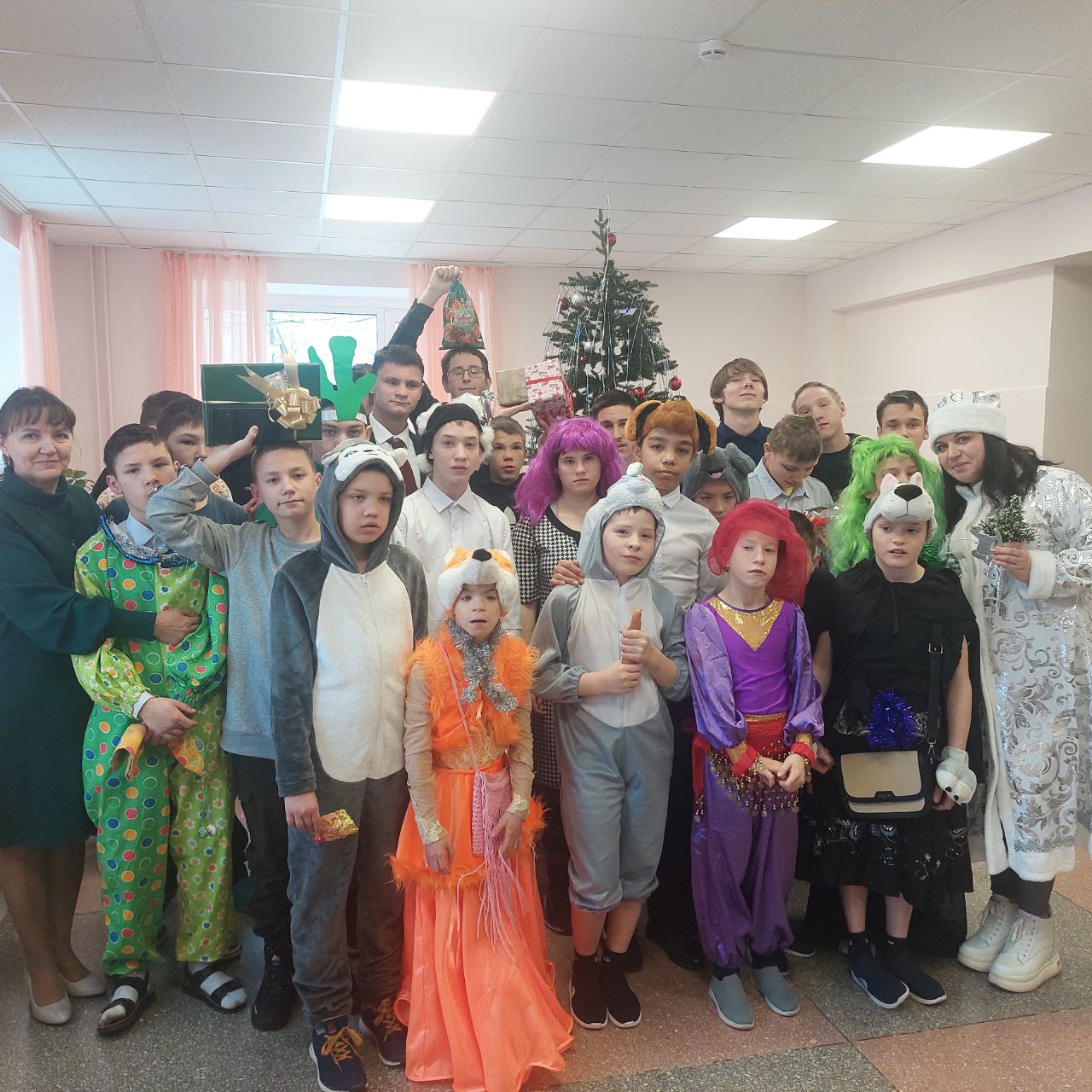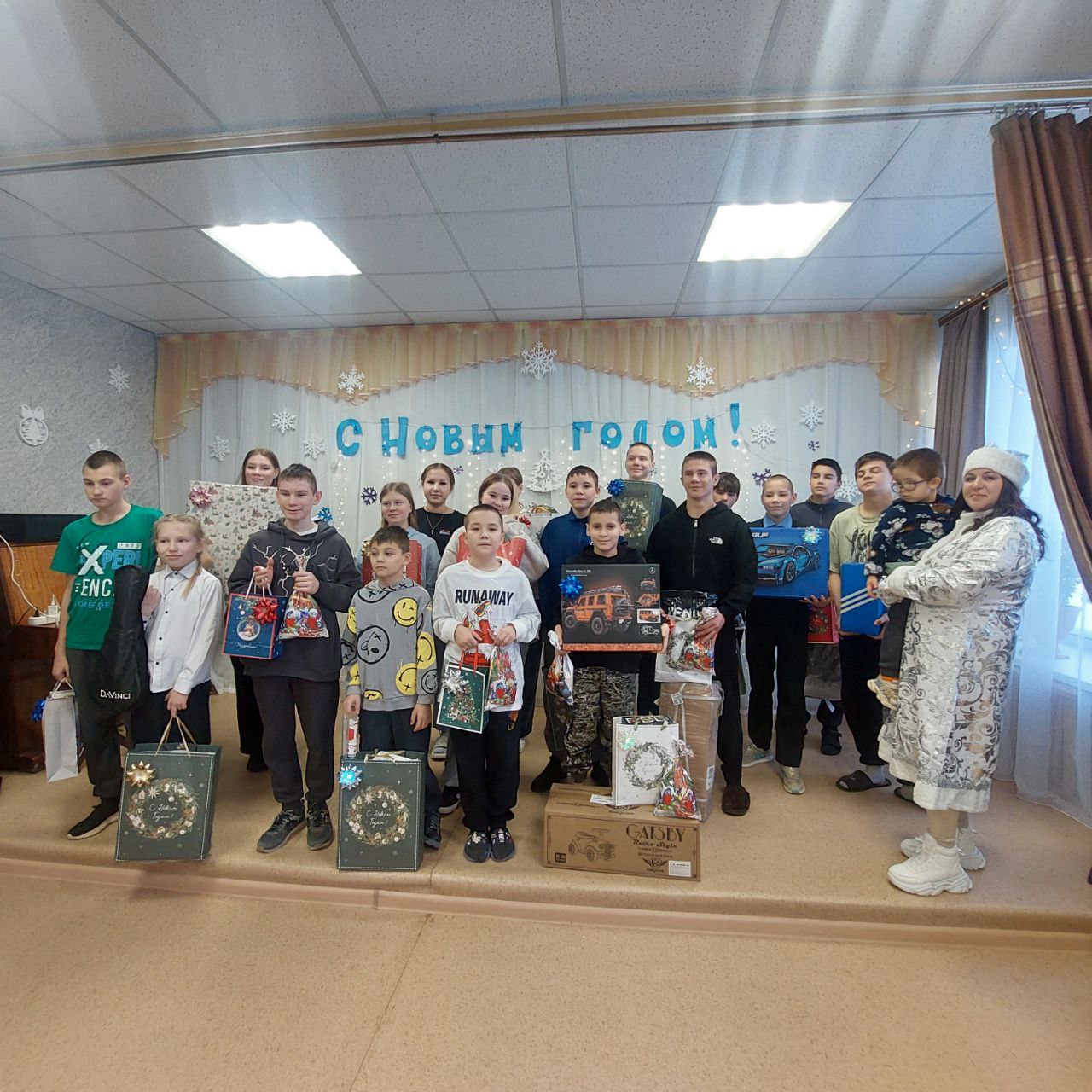 28.12.2025г. дети получили мягкие игрушки, конструкторы, наушники, машинки на п/у, средства уходу за волосами, сумки, чемодан, беспроводные музыкальные колонки и многое другое.